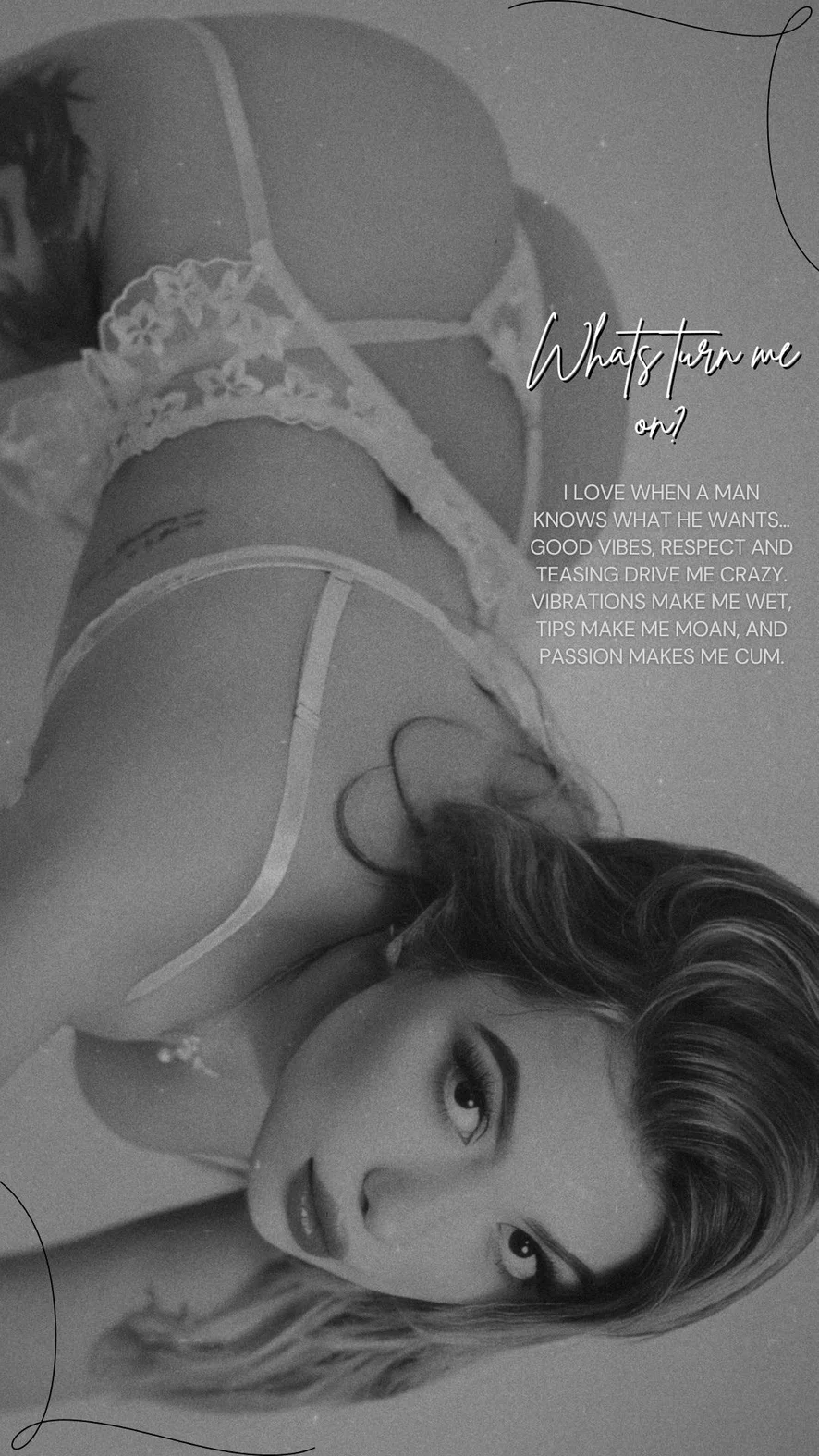 Me encanta cuando un hombre sabe lo que quiere... la buena onda, el respeto y jugar con tu mente. Las vibraciones me mojan, tus tips me hacen gemir y la pasión me hace correrme.